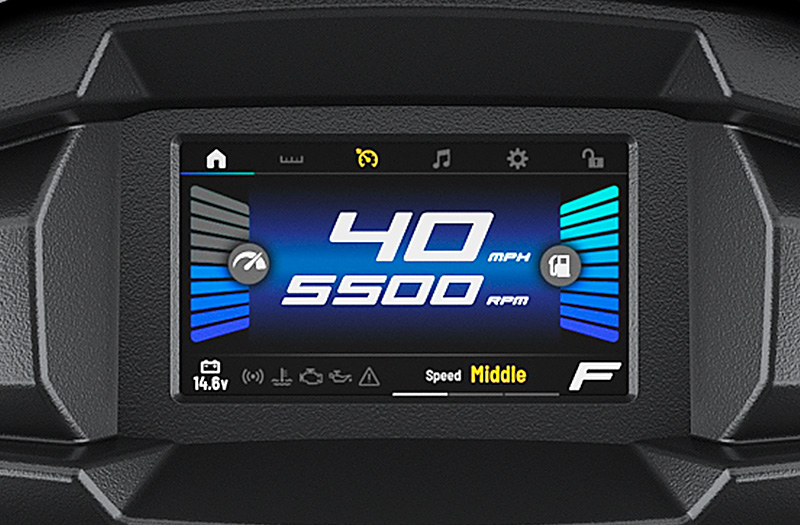 Além das funções básicas de exibição, o sistema oferece Drive Control para personalizar a pilotagem e Modo de Segurança para bloquear o uso não autorizado.
